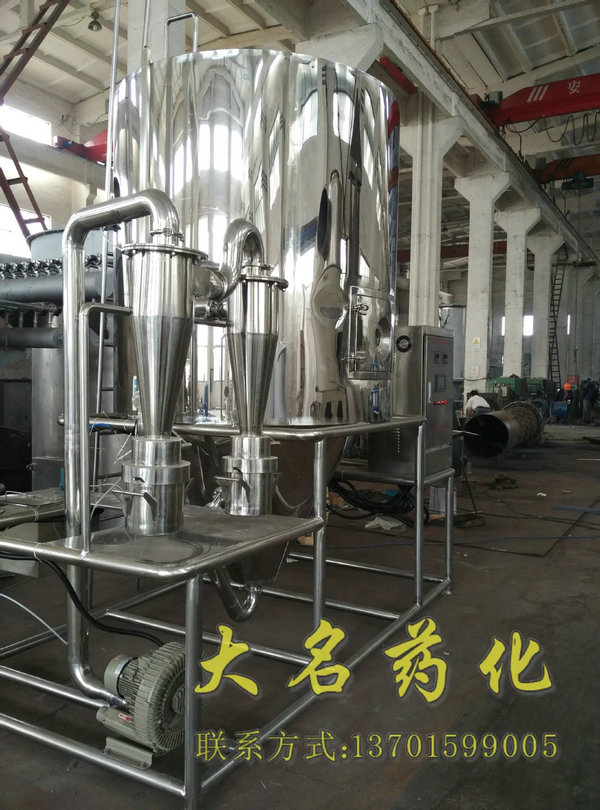 空氣經(jīng)過(guò)濾和加熱,進(jìn)入干燥器頂部空氣分配器,熱空氣呈螺旋狀均勻地進(jìn)入干燥室。料液經(jīng)塔體頂部的高速離心霧化器,(旋轉(zhuǎn))噴霧成極細(xì)微的霧狀液珠,與熱空氣并流接觸在極短的時(shí)間內(nèi)可干燥為成品。成品連續(xù)地由干燥塔底部和旋風(fēng)分離器中輸出,廢氣由風(fēng)機(jī)排空。